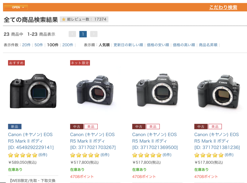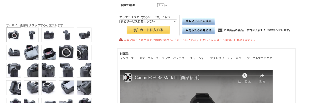 マップカメラ内の検索機能は割と複雑なので、GoogleやSafari、Yahoo!などのブラウザで「R5 mark2 中古」などと検索するとマップカメラの検索結果だけでなく、北村写真館や、フジヤカメラ等も同時に検索できるのでおすすめです。